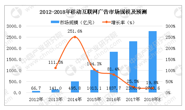 2017年中國移動營銷廣告收入規模為2306.9億元,同比增長25.5%,預計2018年收入規模達到2763.6億元,增長率為19.8%。