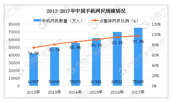 截至2017年底,中國網民規模達7.72億人。普及率為55.8%,相比2016年新增網民4074萬人。中國手機網民規模達到7.53億人,與2016年相比增加了5374萬人,網民中使用手機上網人群的占比與2016年相比提升了2.4%,占整體網民數量的97.5%