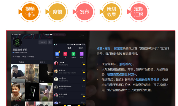 我們的專業抖音營銷團隊幫企業操作全套專業營銷服務,運營一個月,包括視頻制作、剪輯、發布,數據維護等,代運營,定期反饋結果。